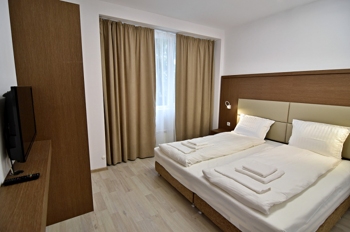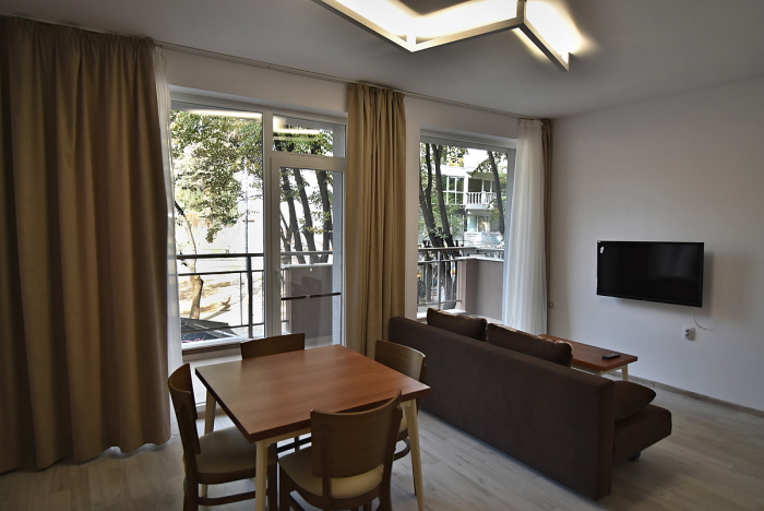 Апартамент 24 е с гледка към пешеходната зона, водеща към фонтана на центъра. Разполага с напълно оборудвана кухня, в която да приготвяте и сами обяда и вечерята, а точно до нея е разположена трапезарна маса. Апартаментът е с отворен план, затова и веднага до тях е разположена всекидневната, в която има удобно канапе, както и телевизор с кабелна телевизия, на който да не изпускате следените от вас предавания!